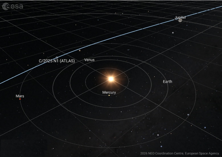 △彗星3I/ATLAS穿越太阳系内侧的轨迹示意图。来源:ESA NEOCC。