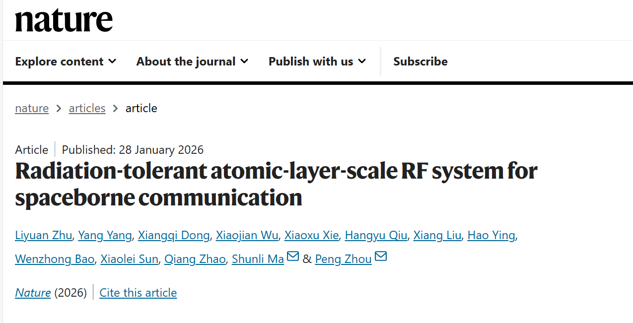 1月29日,集成芯片与系统全国重点实验室、集成电路与微纳电子创新学院周鹏-马顺利团队在《自然》发表研究成果,首次实现基于原子层半导体的射频通信系统在轨运行验证。他们研制的“青鸟”原子层半导体抗辐射射频通信系统,依托极薄的二维材料,展现出稳定运行与抗辐射性能,为构建更轻、更节能的空间通信系统提供了新的可能性。“超长寿命”与“超低功耗”两大核心优势,奠定二维电子系统在深空探测、高轨卫星、星际通信等前沿空间任务中的独特竞争力。