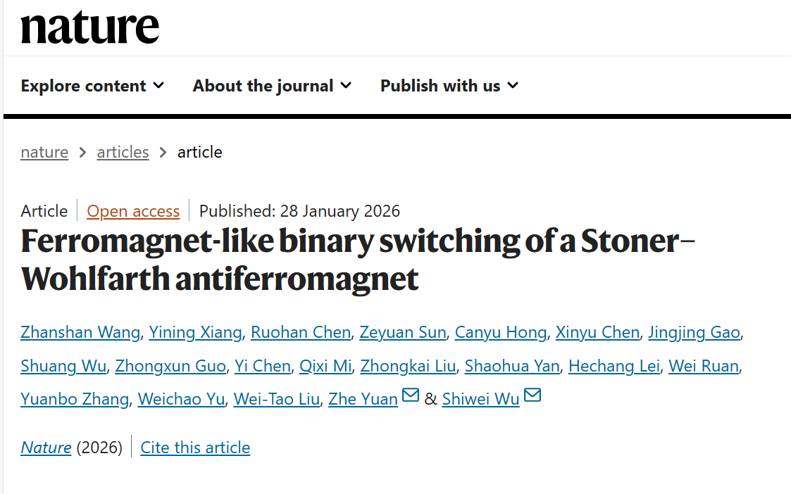 北京时间1月29日,《自然》(Nature)杂志刊发了应用表面物理全国重点实验室吴施伟和复旦大学袁喆团队的最新研究。这是顶刊论文标题中,首次出现“Stoner–Wohlfarth反铁磁体”这一新术语。