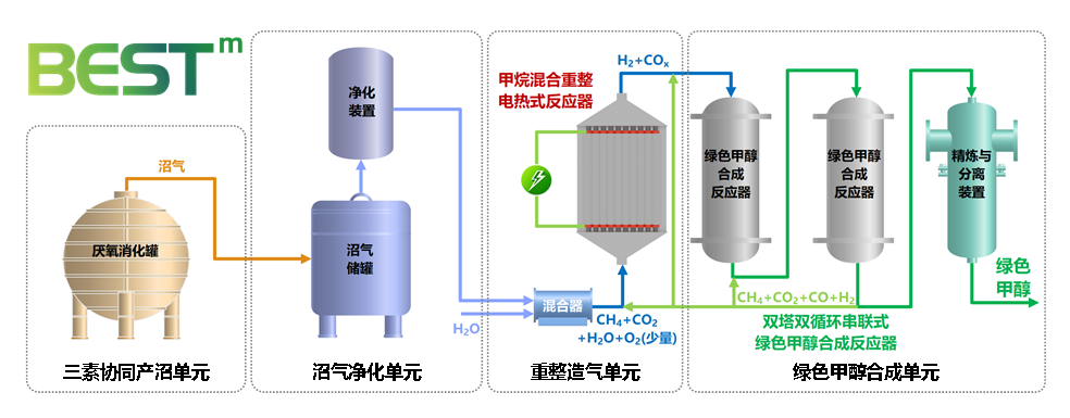 国际先进的BESTm工艺背后,是一套全链条创新的技术逻辑。首先在源头,团队首创“三素协同厌氧发酵”技术,让湿垃圾中的木质素、纤维素、半纤维素更高效地产出沼气,在原料上实现“多产沼”。在中间转化环节,工艺打破传统分离二氧化碳的模式,让甲烷与二氧化碳共同进入团队自主研发的混合重整反应器,以绿电为热源,将二者直接转化为合成气,实现“全碳素转化”与“近零碳排放”的双重突破。
