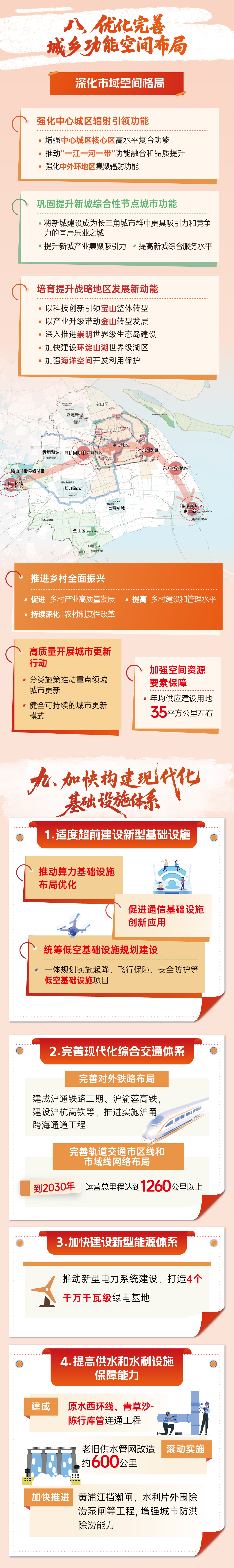 共分为三个部分。第一部分是总论,包括第一章、第二章,重点回顾“十四五”时期上海取得的成绩,同时明确“十五五”时期的发展方向、总体思路和目标。 第二部分是重点任务和举措,从第三章到第十五章,一共13个方面,围绕各领域系统部署“十五五”时期上海经济社会发展的重点任务和具体举措。 第三部分是实施保障,也就是第十六章。将按照《上海市发展规划条例》的要求,进一步强化规划实施的全过程法治保障,确保把发展蓝图一步步落到实处、转化为现实生产力。 关于“十五五”主要目标指标 指导思想 注重体现鲜明的上海特点,可以概括为“四个以、两推动一确保”。“四个以”是指,“以科技创新为引领,以改革开放为动力,以国家重大战略为牵引,以城市治理现代化为保障”,这是习近平总书记2023年底考察上海时提出的明确要求,是做好上海工作的方法论。“两推动一确保”是指,“推动经济实现质的有效提升和量的合理增长,推动共同富裕和人的全面发展迈出坚实步伐,确保加快建成具有世界影响力的社会主义现代化国际大都市取得决定性进展”,体现了上海“十五五”阶段性任务要求。 两个重要时间节点的发展目标 围绕2030年和2035年两个重要时间节点,设置了相关发展目标。到2030年,“五个中心”核心功能持续跃升,全球资源配置力、科技创新策源力、高端产业引领力、开放枢纽门户影响力和文化软实力明显增强,重要领域和关键环节改革取得决定性成果,高水平制度型开放取得更大突破,奋力打造人民城市最佳实践地,人民生活品质不断提高,社会主义现代化国际大都市的世界影响力更加彰显,全球城市综合位势持续进阶。到2035年,上海“五个中心”功能全面升级,重要发展指标达到国际领先水平,城市能级和核心竞争力显著提升,人均地区生产总值比2020年翻一番,基本建成具有世界影响力的社会主义现代化国际大都市。 主要指标 《纲要》设置了20个主要指标,其中14项是预期性指标,6项是约束性指标。设置这些指标,主要有三点考虑:一是引领性,坚持“少而精”,用有代表性、指引性的指标牵引经济社会发展,展现上海的使命担当。二是创新性,瞄准“十五五”具有紧迫性的重点任务,在与“十四五”有机衔接的基础上,根据新情况进行调整,更加符合“十五五”阶段性特征。三是针对性,因地制宜、有的放矢,更加突出上海特色,也更加贴近市民切实感受。具体来看:聚焦经济“质的有效提升”与“量的合理增长”,设置了经济增长、效益提升、结构优化等指标。聚焦“五个中心”建设,设置了金融、贸易、航运、科创等指标。聚焦民生期待,设置了就业、收入、住房、养老等指标。聚焦绿色发展,设置了绿色低碳转型、韧性安全治理等指标。此外,《纲要》还明确了40多个具体领域的工作目标,用来更好指导各领域工作开展。 关于“十五五”时期13个方面的重大举措 可以概括为“三个新”:新动能、新空间、新品质。 01.新动能 核心是围绕“五个中心”建设,增强城市核心功能。国际经济中心重在提升地位和全球影响力,构建“2+3+6+6”现代化产业体系(“2”,是指推动传统产业数智化、绿色化转型,“3”是指加快发展三大先导产业,第一个“6”是指打造六大新兴支柱产业集群,第二个“6”是指前瞻布局六大未来产业),同时激发服务业创新活力,加快产业、空间和要素聚集,扩大内需,培育世界一流企业,提升全球经济治理影响力。国际金融中心重在提高竞争力和国际化水平,稳步扩大金融高水平对外开放,加快建设人民币资产全球配置中心和风险管理中心,完善市场、机构、产品服务、基础设施“四个体系”,提高金融服务实体经济质效。国际贸易中心重在强化枢纽功能,巩固全球贸易网络枢纽地位,引进培育一批全球供应链管理中心,做强大宗商品资源配置功能,加快推动贸易结构转型和创新发展。国际航运中心重在提升资源配置能力,巩固提升海空枢纽港地位,建设长三角世界级港口群和机场群,提升全链条航运服务竞争力,加快航运数字、智能、绿色转型。国际科技创新中心重在增强策源功能,加强原始创新和关键核心技术攻关,推动科技创新和产业创新深度融合,一体推进教育科技人才发展,优化科技创新中心功能布局。同时,上海作为改革开放前沿,“十五五”时期将全面深化高水平改革开放。依托浦东、临港、虹桥、东方枢纽等国家战略平台,稳步扩大制度型开放,加快构建更高水平开放型经济新体制,持续优化国际一流营商环境,深化高水平社会主义市场经济体制改革,激发各类主体创新发展活力。 02.新空间 主要包括长三角区域和上海市域两个层面。聚焦长三角区域,落实长三角一体化发展国家重大战略,单独设置长三角一体化发展章节。统筹科技创新和产业创新、龙头带动和各扬所长、硬件联通和机制协同、生态环保和经济发展,聚焦重点领域精耕细作、体制机制支撑保障、重点区域联动发展,全力推进上海(长三角)科创中心建设,推动G60科创走廊和沿沪宁产业创新带建设走深走实。携手苏浙皖持续巩固提升长三角高质量发展动力源作用,推动长三角地区在中国式现代化中走在前列。在市域层面,优化完善城乡功能空间布局,加快构建现代化基础设施体系。深化“中心辐射、两翼齐飞、新城发力、南北转型”的市域空间格局,强化中